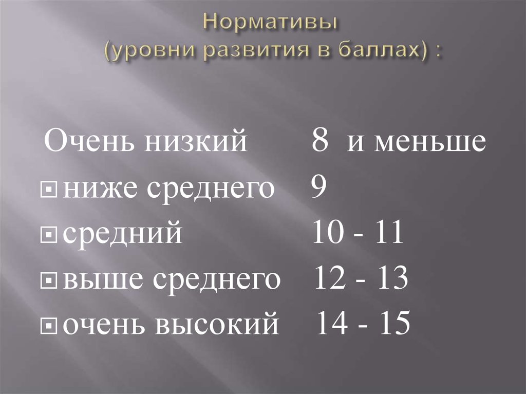 Нормативы (уровни развития в баллах) :