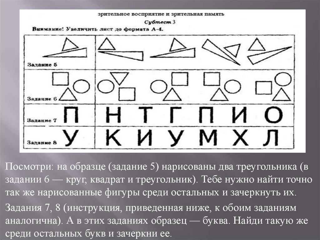 Посмотри: на образце (задание 5) нарисованы два треугольника (взадании 6 — круг, квадрат и треугольник). Тебе нужно найти точно