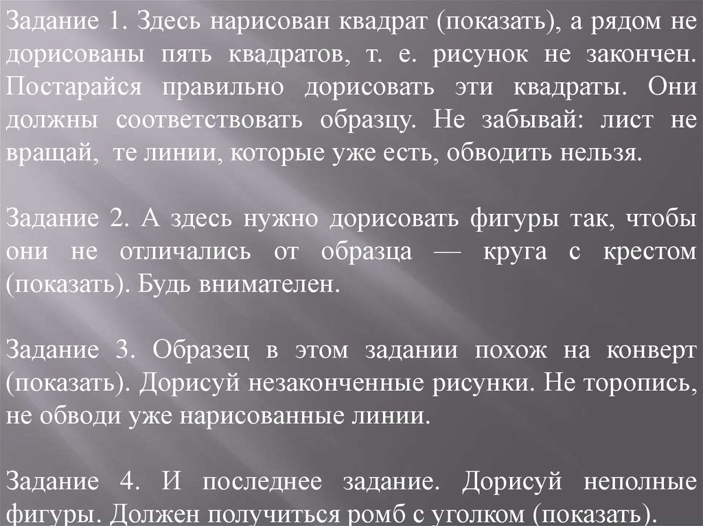 Задание 1. Здесь нарисован квадрат (показать), а рядом недорисованы пять квадратов, т. е. рисунок не закончен.