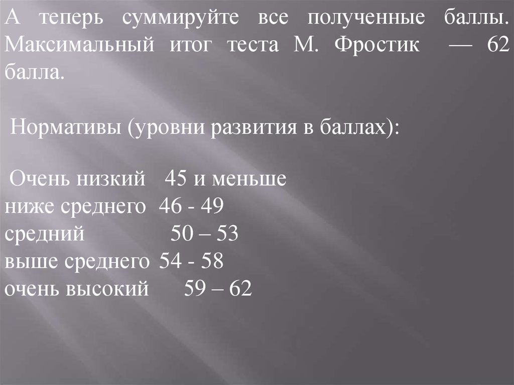 А теперь суммируйте все полученные баллы.Максимальный итог теста М. Фростик — 62