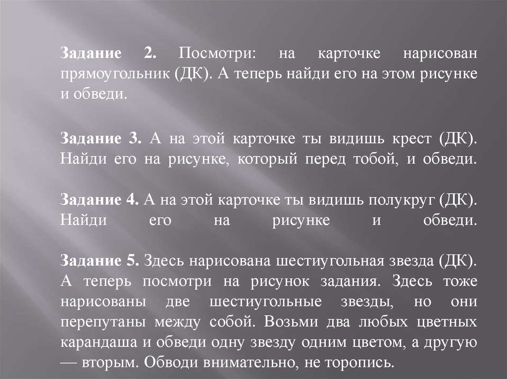 Задание 2. Посмотри: на карточке нарисованпрямоугольник (ДК). А теперь найди его на этом рисунке