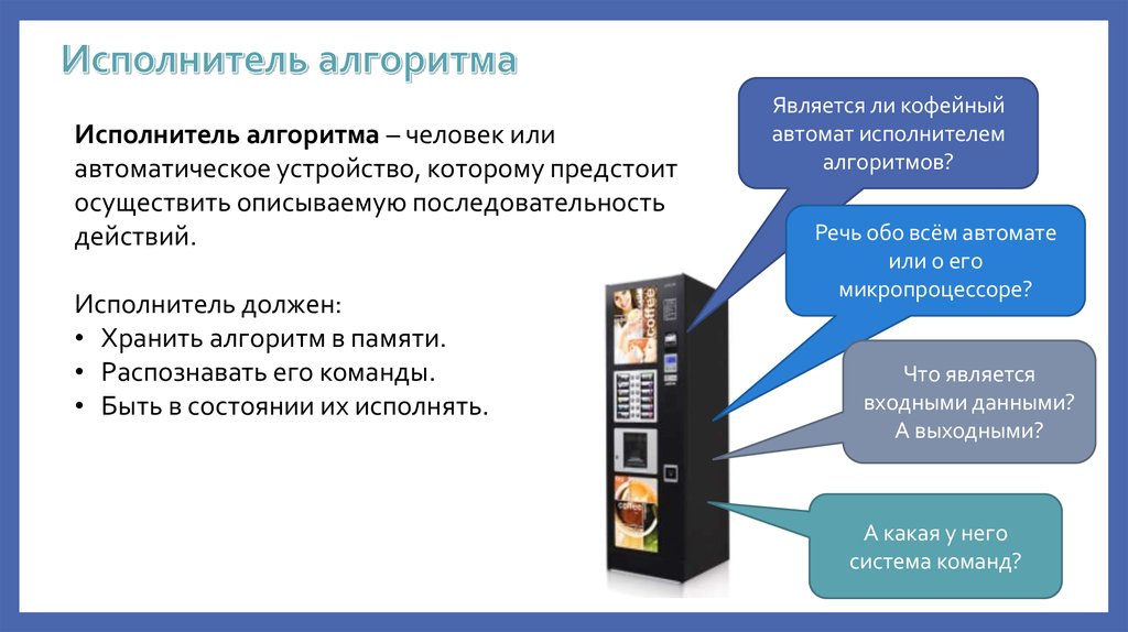 Исполнитель алгоритма – человек илиавтоматическое устройство, которому предстоит