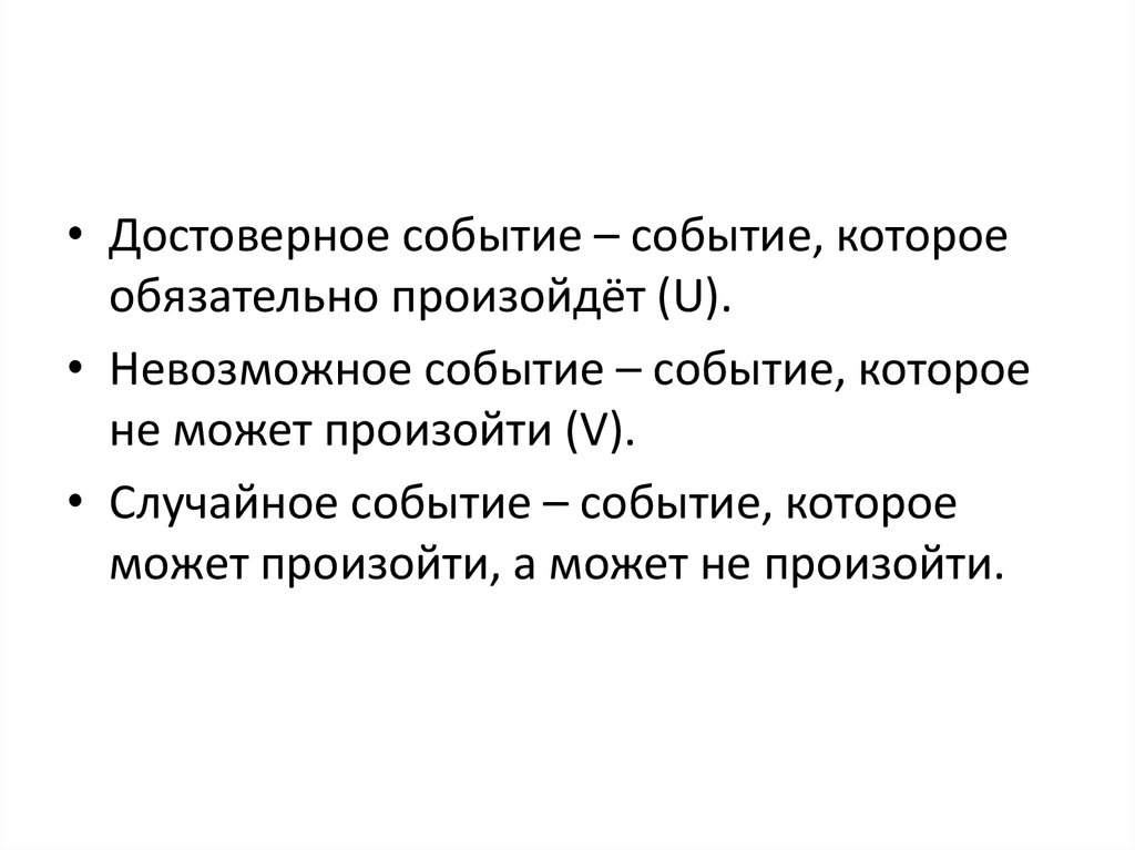 • Достоверное событие – событие, котороеобязательно произойдёт (U).