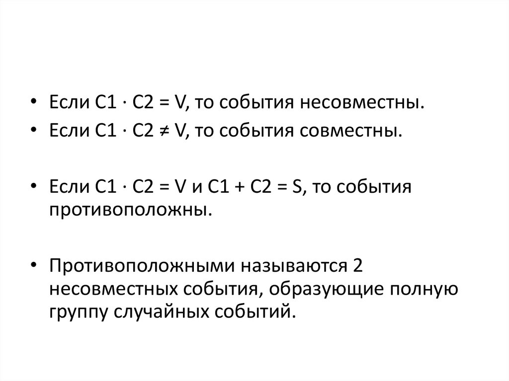 • Если С1 ∙ С2 = V, то события несовместны.• Если С1 ∙ С2 ≠ V, то события совместны.