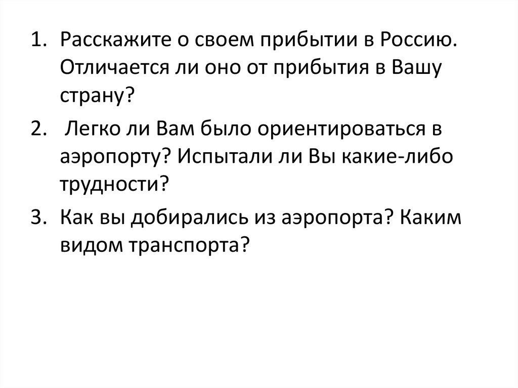 1. Расскажите о своем прибытии в Россию.Отличается ли оно от прибытия в Вашу