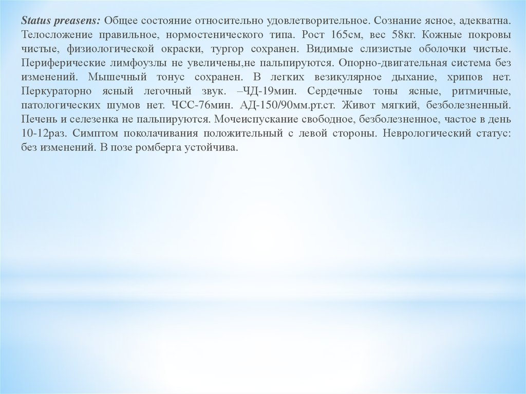 Status preasens: Общее состояние относительно удовлетворительное. Сознание ясное, адекватна.Телосложение правильное, нормостенического типа. Рост 165см, вес 58кг. Кожные покровы