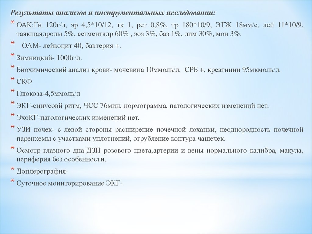 Результаты анализов и инструментальных исследовании:* ОАК:Гн