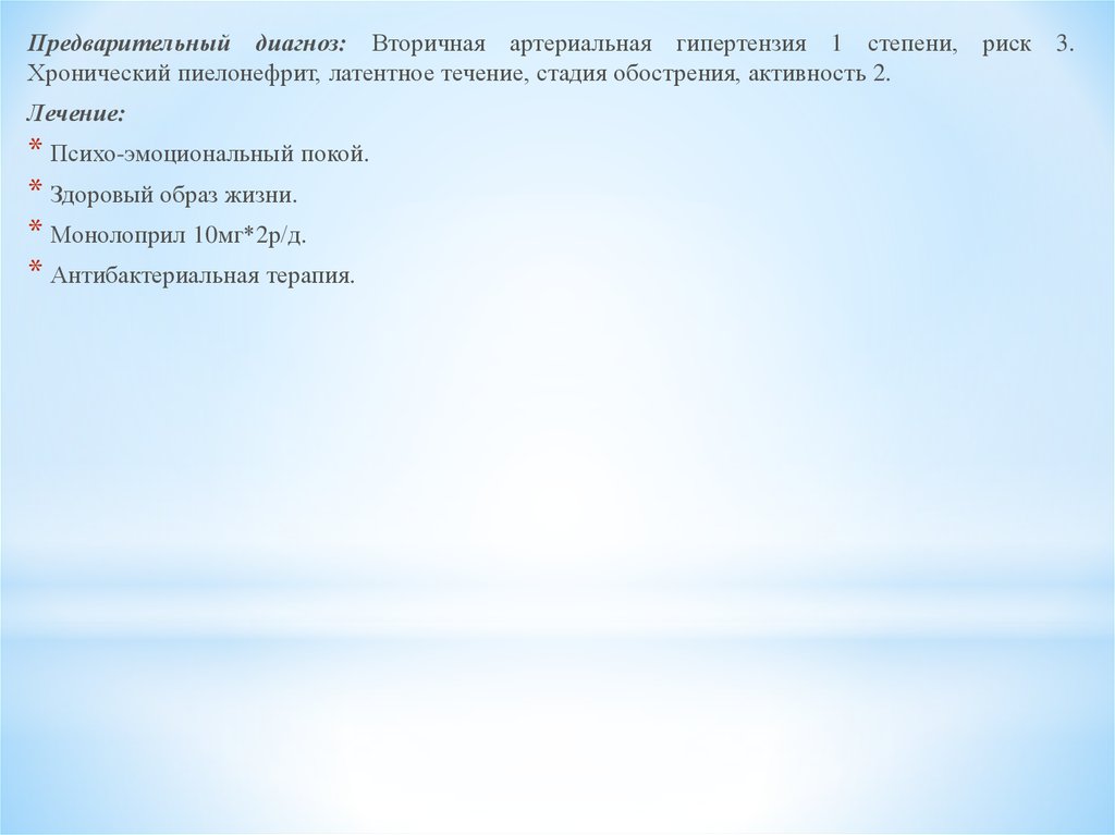 Предварительный диагноз: Вторичная артериальная гипертензия 1 степени, риск 3.Хронический пиелонефрит, латентное течение, стадия обострения, активность 2.