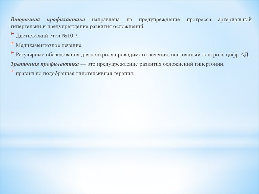 Вторичная профилактика направлена на предупреждениегипертензии и предупреждение развития осложнений.