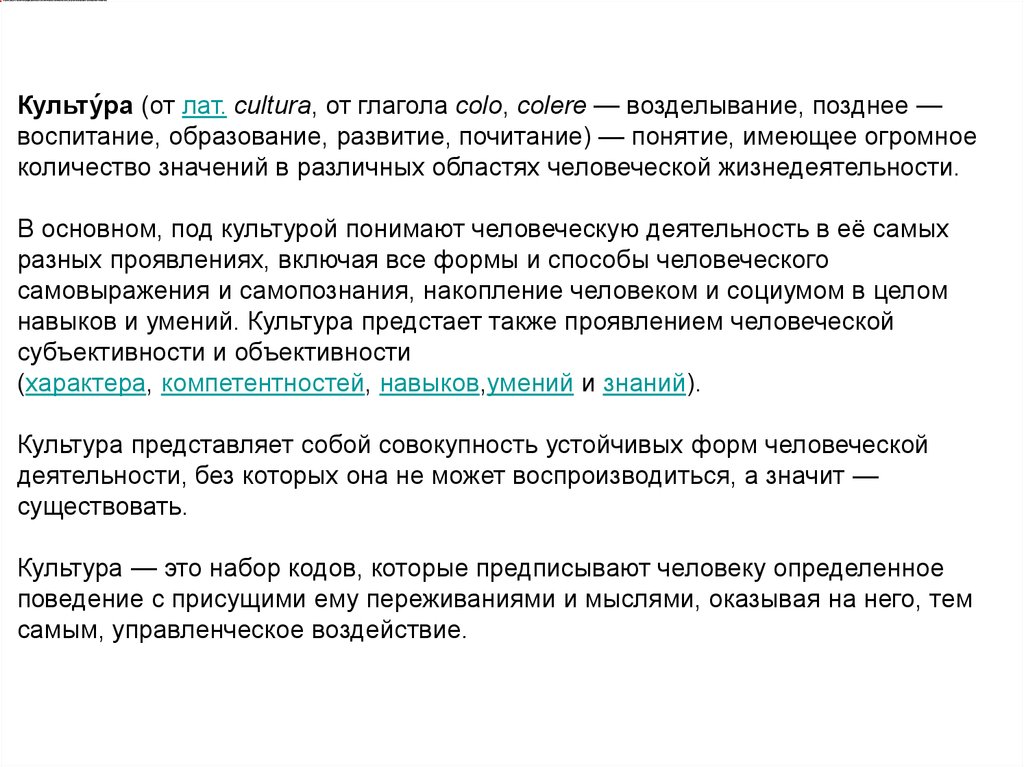 Культу́ра (от лат. cultura, от глагола colo, colere — возделывание, позднее —воспитание, образование, развитие, почитание) — понятие, имеющее огромное