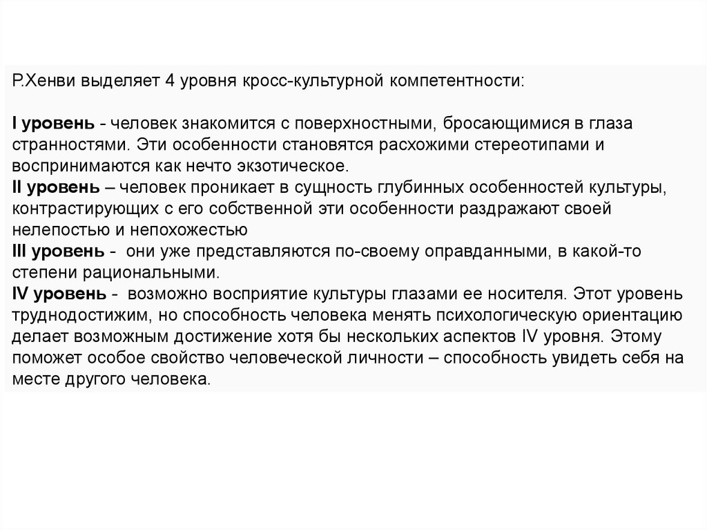 Р.Хенви выделяет 4 уровня кросс-культурной компетентности:I уровень - человек знакомится с поверхностными, бросающимися в глаза