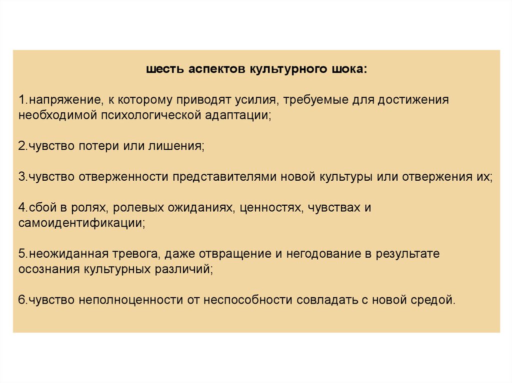 шесть аспектов культурного шока:1.напряжение, к которому приводят усилия, требуемые для достижения