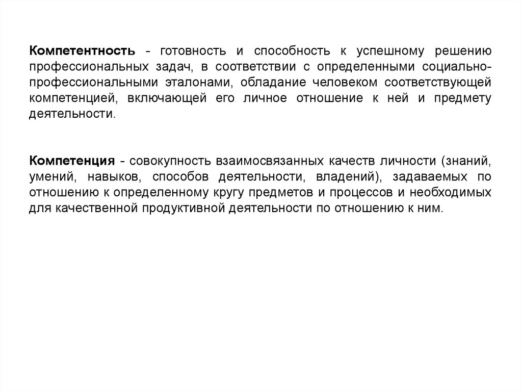 Компетентность - готовность и способность к успешному решениюпрофессиональных задач, в соответствии с определенными социальнопрофессиональными эталонами, обладание человеком соответствующей