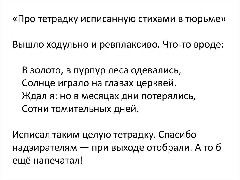 «Про тетрадку исписанную стихами в тюрьме»Вышло ходульно и ревплаксиво. Что-то вроде: