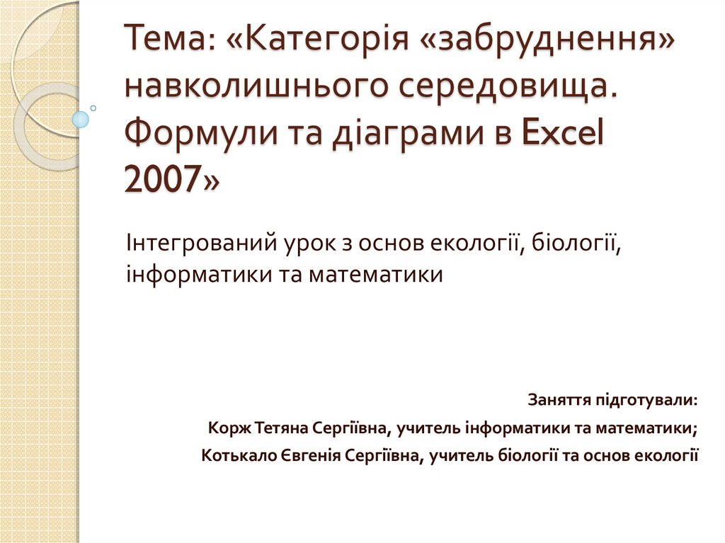 1. Тема: «Категорія «забруднення» навколишнього середовища. Формули та діаграми в Excel 2007»