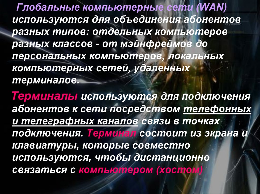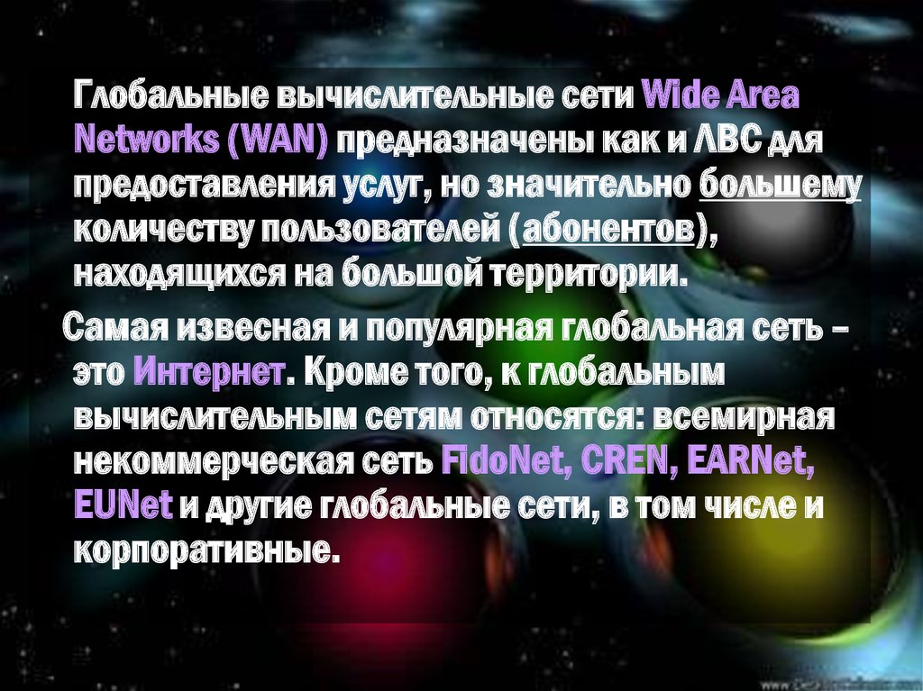 Глобальные компьютерные сети (WAN)используются для объединения абонентов