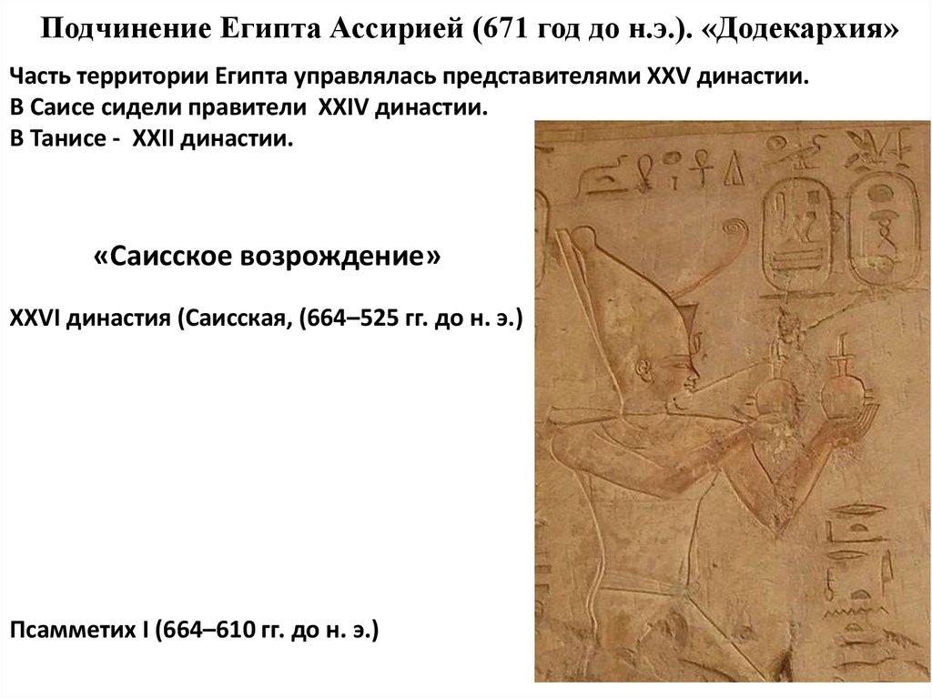 Подчинение Египта Ассирией (671 год до н.э.). «Додекархия»Часть территории Египта управлялась представителями XXV династии.