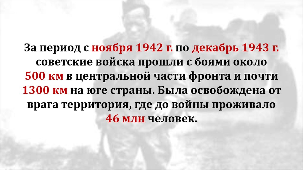 За период с ноября 1942 г. по декабрь 1943 г.советские войска прошли с боями около