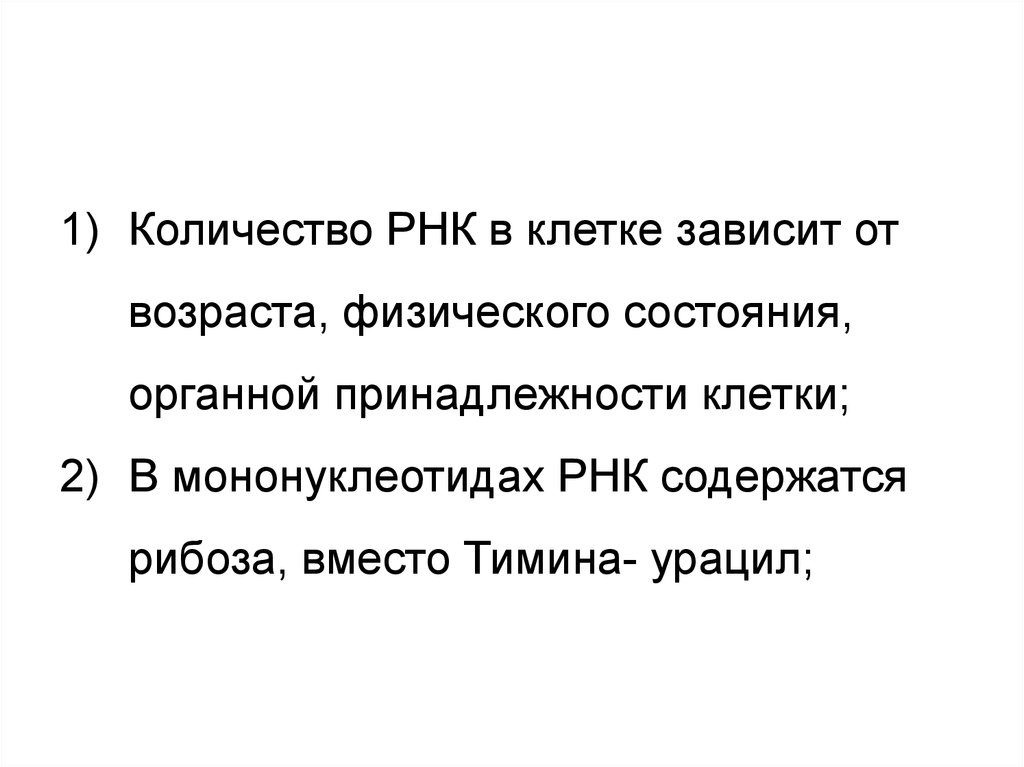 1) Количество РНК в клетке зависит отвозраста, физического состояния,