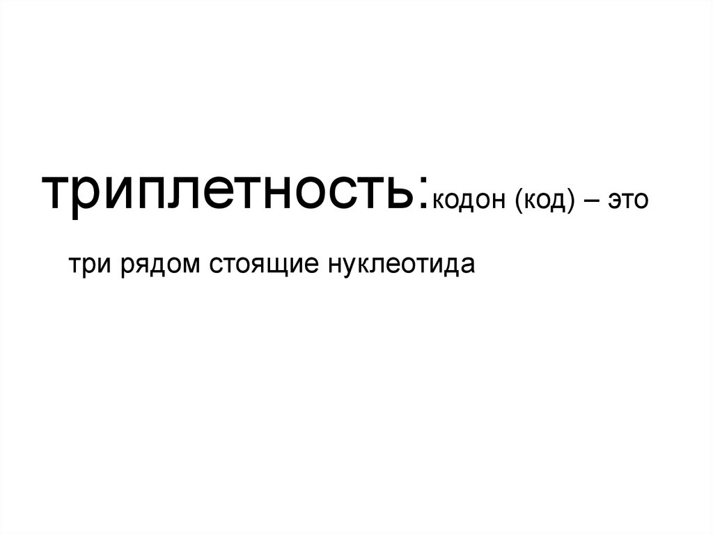 триплетность:кодон (код) – этотри рядом стоящие нуклеотида