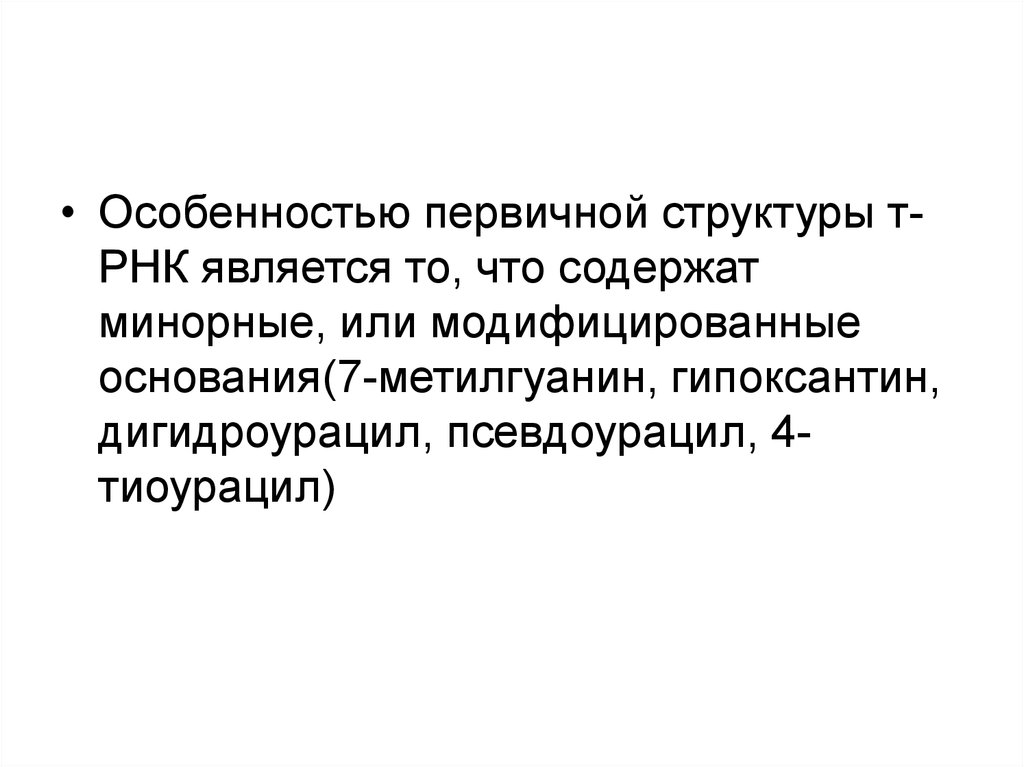 • Особенностью первичной структуры тРНК является то, что содержатминорные, или модифицированные