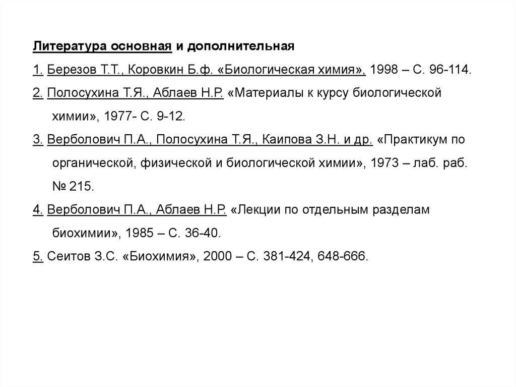 Литература основная и дополнительная1. Березов Т.Т., Коровкин Б.ф. «Биологическая химия», 1998 – С. 96-114.