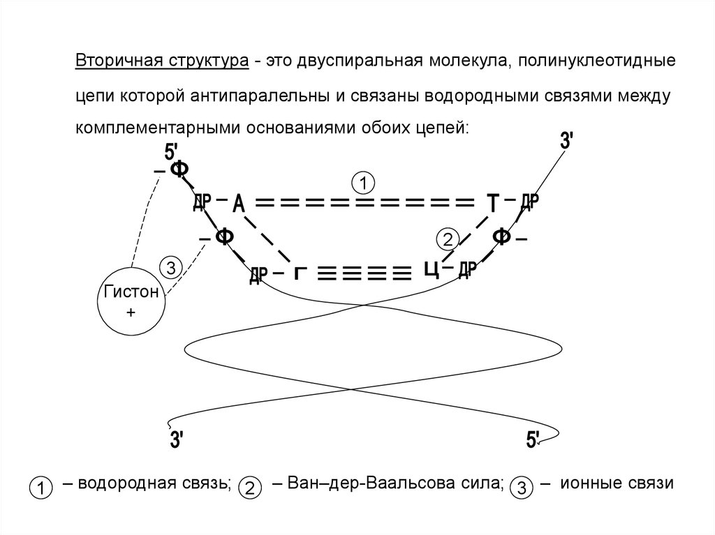 Вторичная структура - это двуспиральная молекула, полинуклеотидныецепи которой антипаралельны и связаны водородными связями между