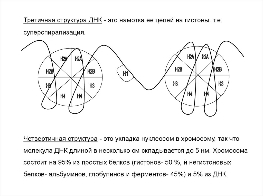 Третичная структура ДНК - это намотка ее цепей на гистоны, т.е.суперспирализация.