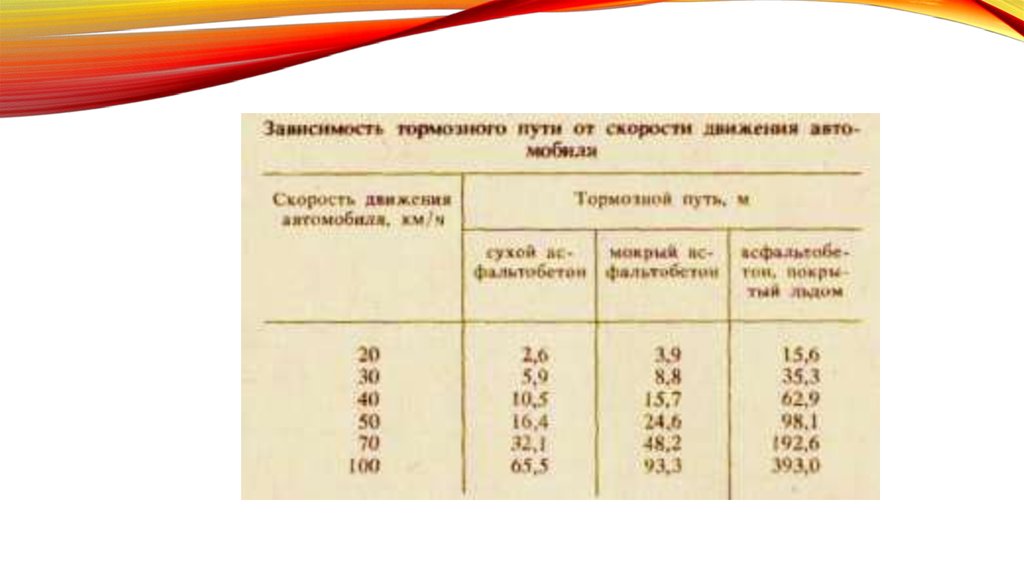 Величина тормозного пути в зависимости от скорости и состояниядорожного покрытия