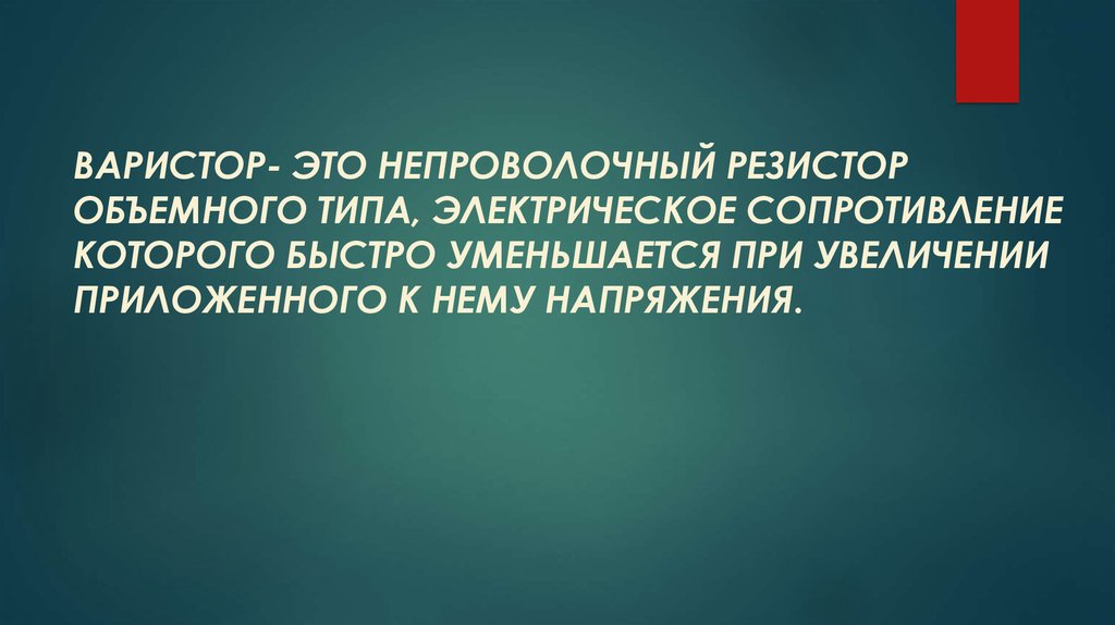 ВАРИСТОР- ЭТО НЕПРОВОЛОЧНЫЙ РЕЗИСТОРОБЪЕМНОГО ТИПА, ЭЛЕКТРИЧЕСКОЕ СОПРОТИВЛЕНИЕ