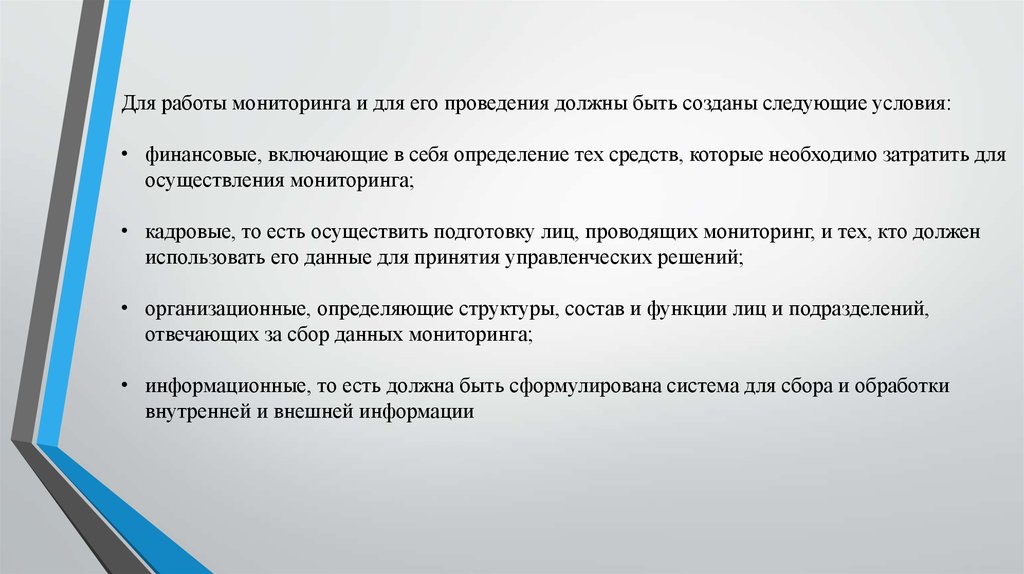 Для работы мониторинга и для его проведения должны быть созданы следующие условия:• финансовые, включающие в себя определение тех средств, которые необходимо затратить для