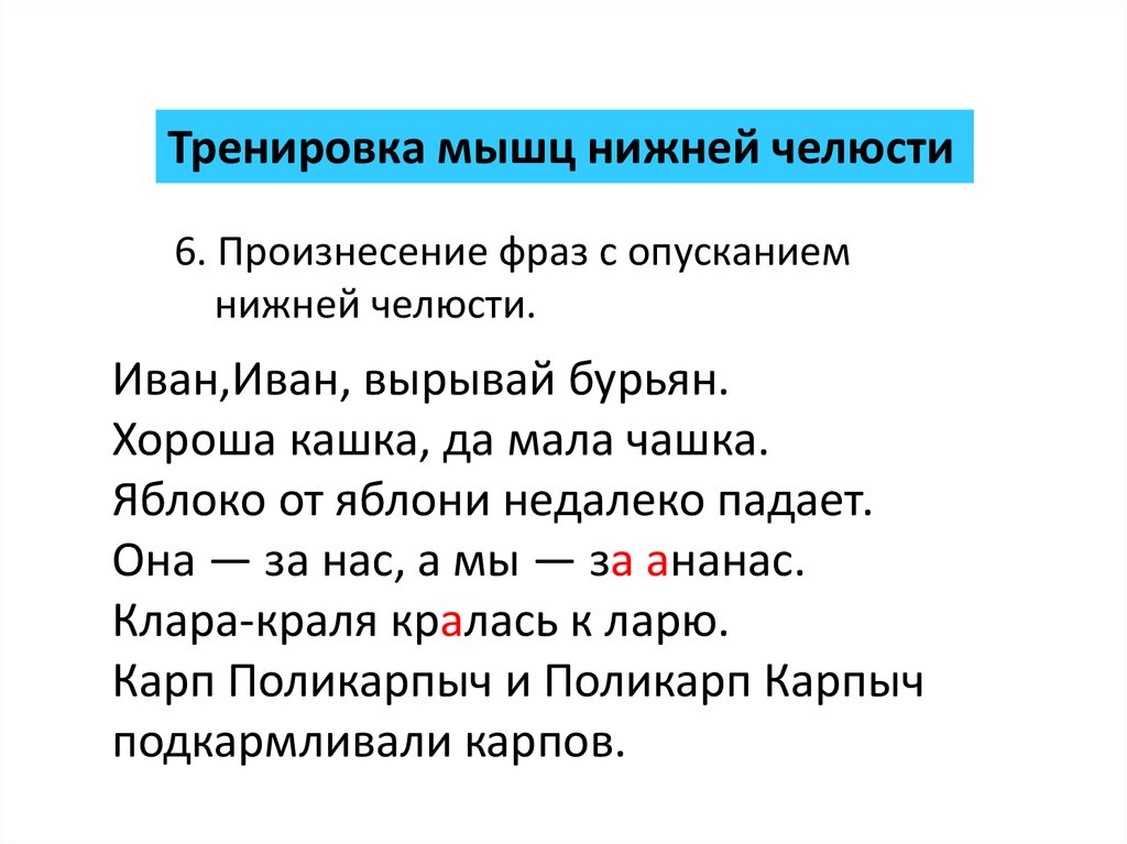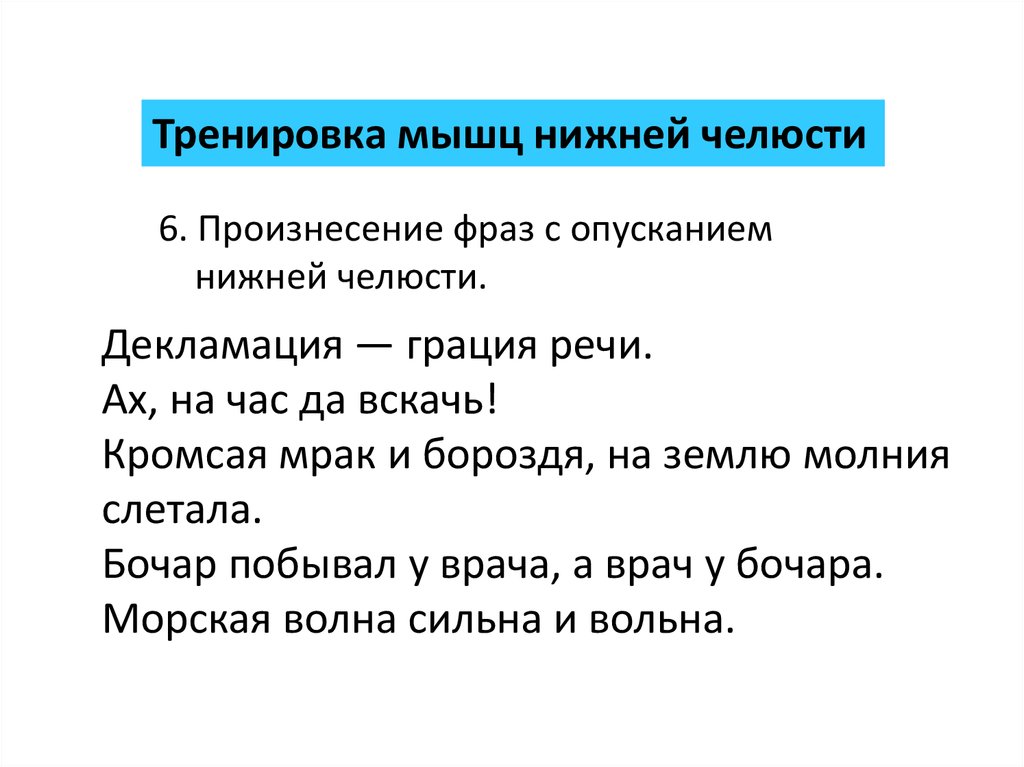 Тренировка мышц нижней челюсти6. Произнесение фраз с опусканием