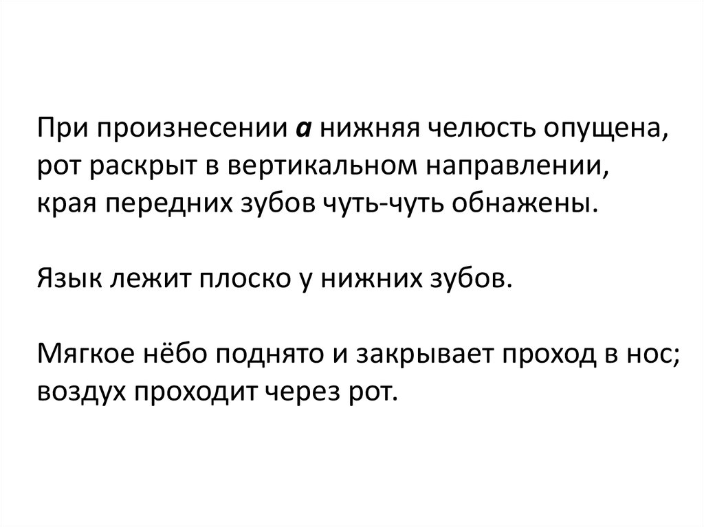 При произнесении а нижняя челюсть опущена,рот раскрыт в вертикальном направлении,
