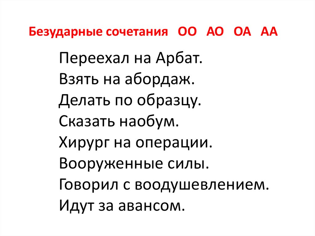 Безударные сочетания ОО АО ОА ААПереехал на Арбат.