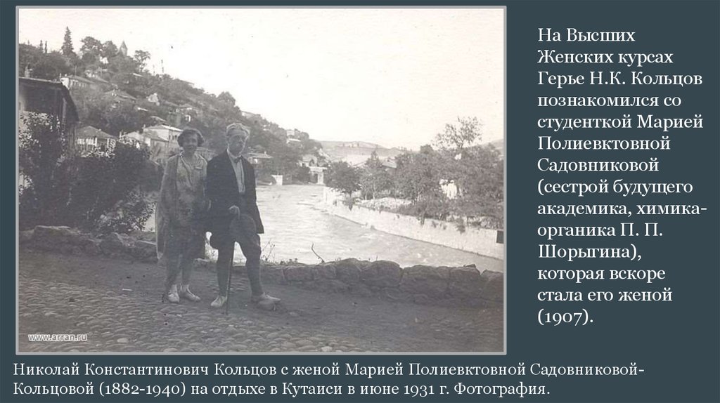 Николай Константинович Кольцов с женой Марией Полиевктовной СадовниковойКольцовой (1882-1940) на отдыхе в Кутаиси в июне 1931 г. Фотография.
