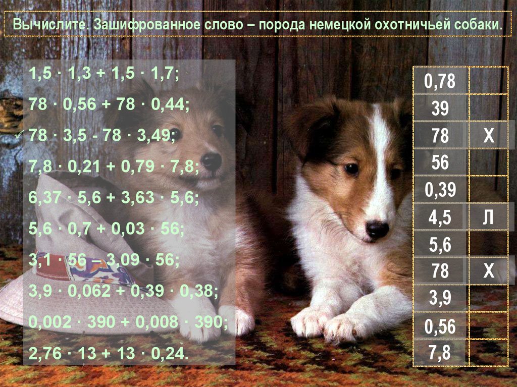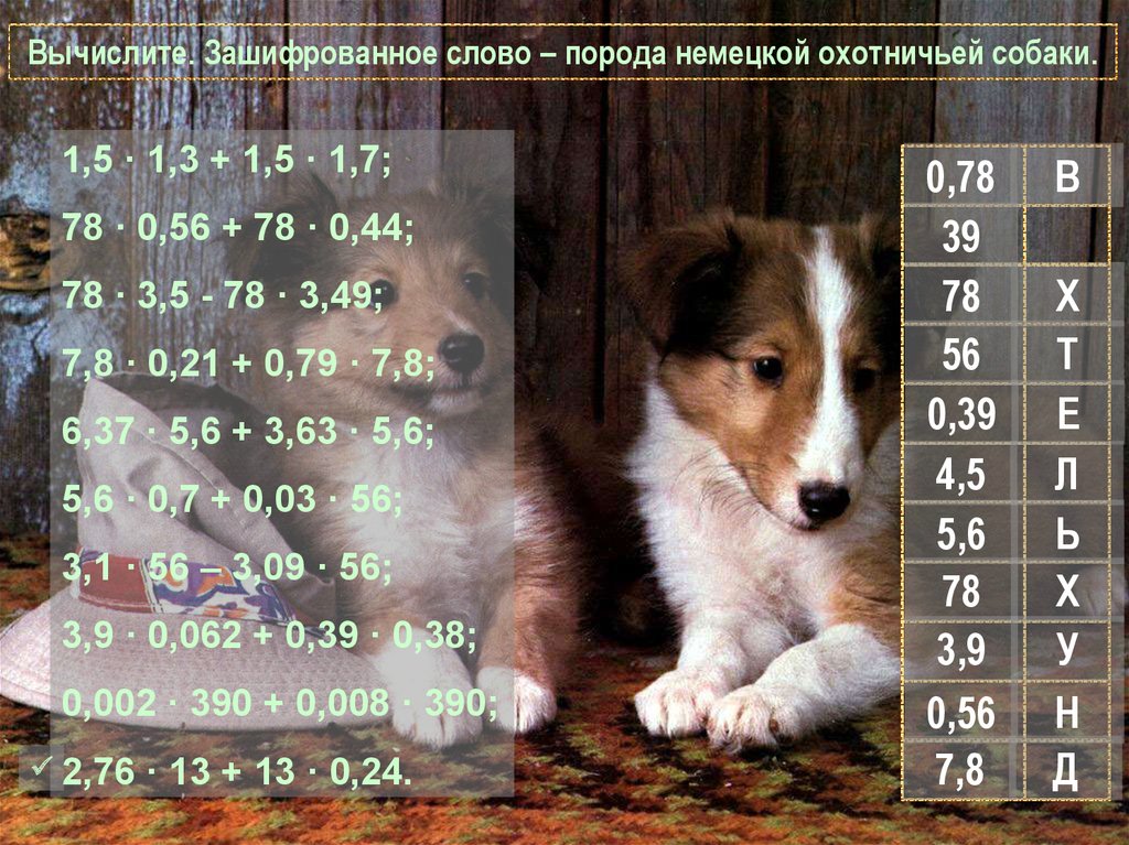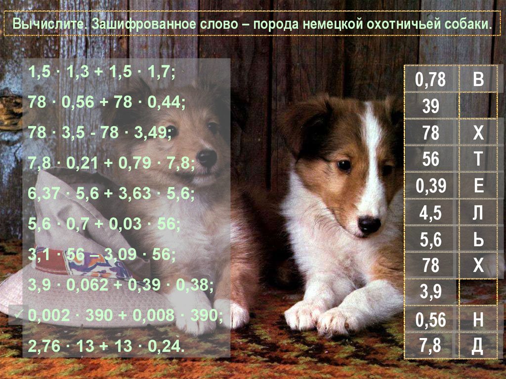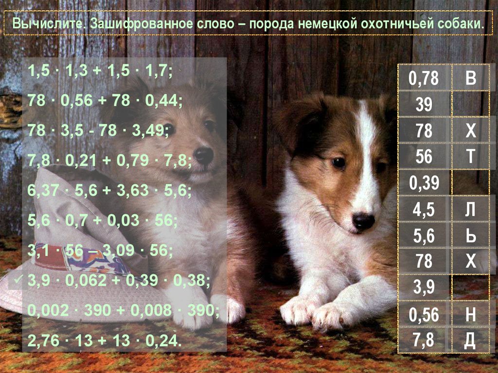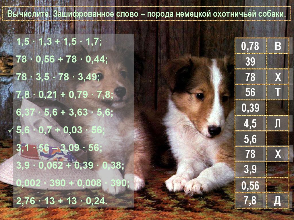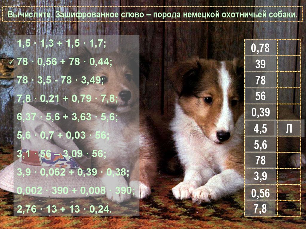 Вычислите. Зашифрованное слово – порода немецкой охотничьей собаки.1,5 · 1,3 + 1,5 · 1,7;