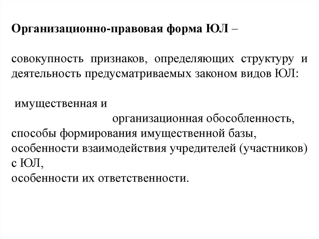 Организационно-правовая форма ЮЛ –совокупность признаков, определяющих структуру и