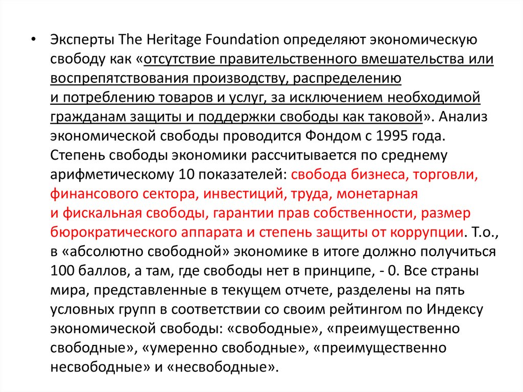 • Эксперты The Heritage Foundation определяют экономическуюсвободу как «отсутствие правительственного вмешательства или