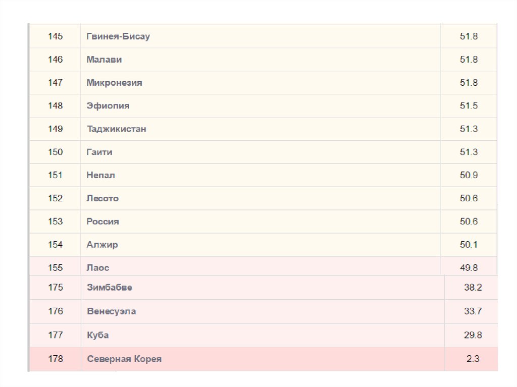 100 баллов, а там, где свободы нет в принципе, - 0. Все страны