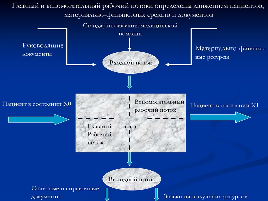 Главный и вспомогательный рабочий потоки определены движением пациентов,материально-финансовых средств и документов