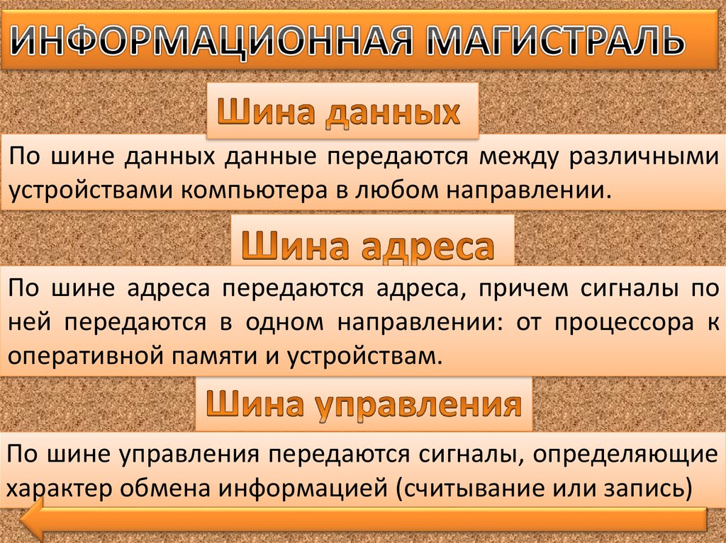 По шине данных данные передаются между различнымиустройствами компьютера в любом направлении.