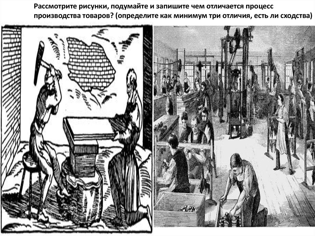 Рассмотрите рисунки, подумайте и запишите чем отличается процесспроизводства товаров? (определите как минимум три отличия, есть ли сходства)