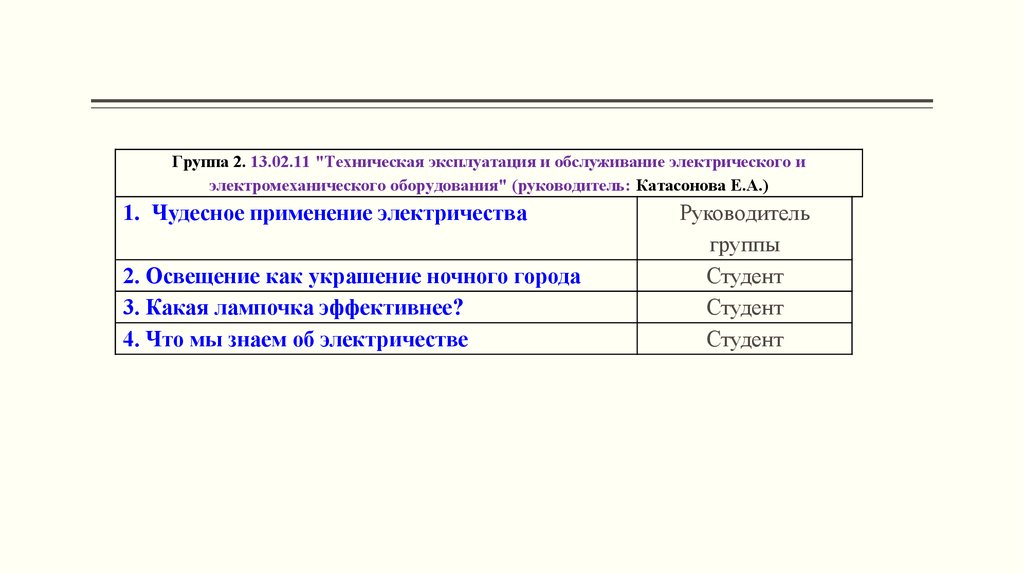 Группа 2. 13.02.11 "Техническая эксплуатация и обслуживание электрического иэлектромеханического оборудования" (руководитель: Катасонова Е.А.)