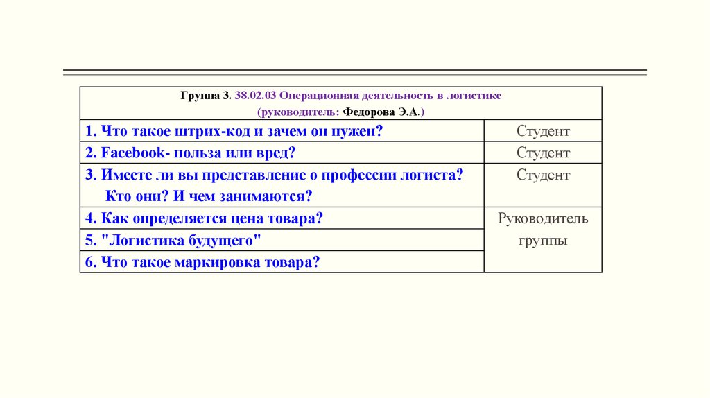 Группа 3. 38.02.03 Операционная деятельность в логистике(руководитель: Федорова Э.А.)