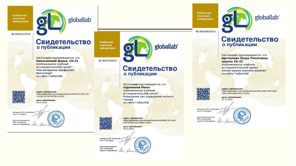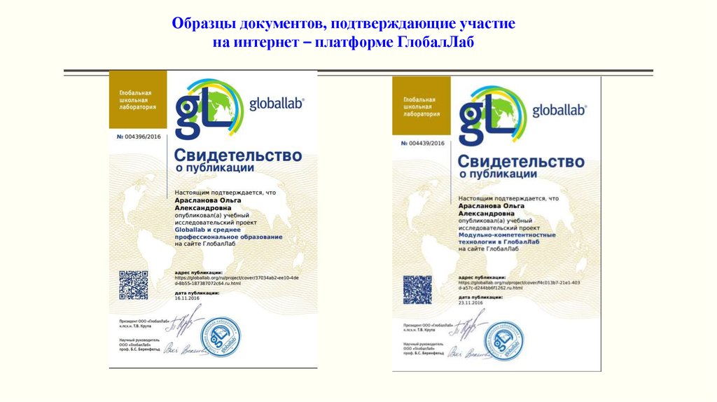 Образцы документов, подтверждающие участиена интернет – платформе ГлобалЛаб