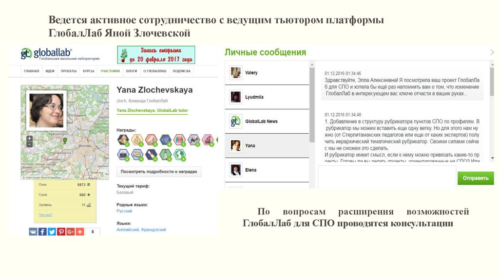 Ведется активное сотрудничество с ведущим тьютором платформыГлобалЛаб Яной Злочевской