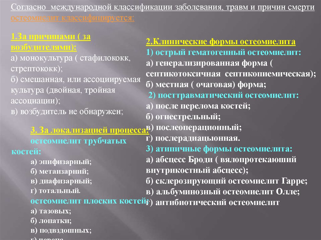 Согласно международной классификации заболевания, травм и причин смертиостеомиелит классифицируется: