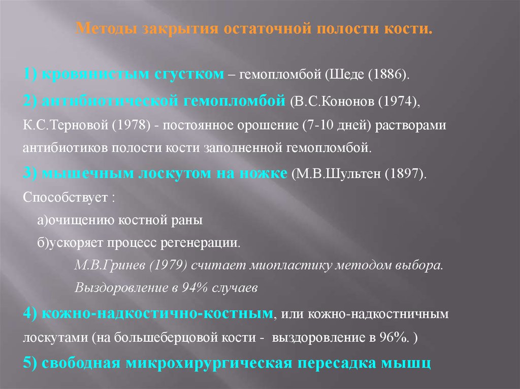 лоскутами (на большеберцовой кости - выздоровление в 96%. )