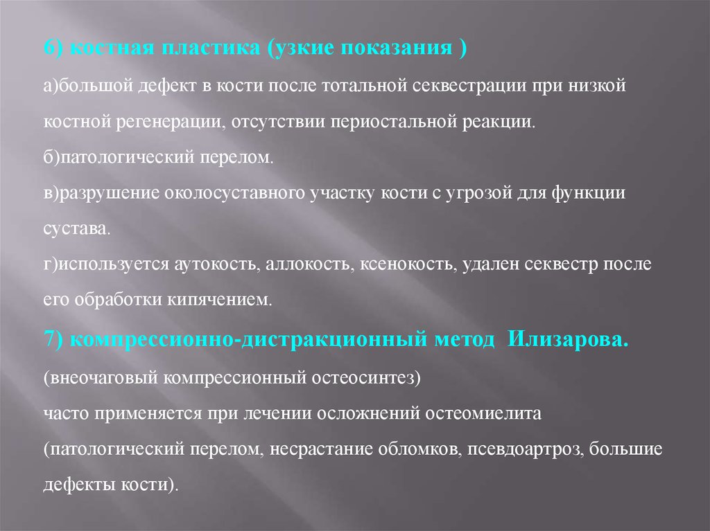 6) костная пластика (узкие показания )а)большой дефект в кости после тотальной секвестрации при низкой
