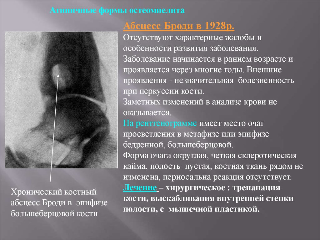 Атипичные формы остеомиелитаАбсцесс Броди в 1928р.